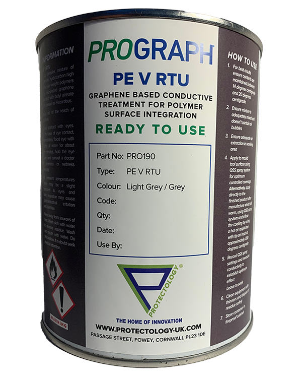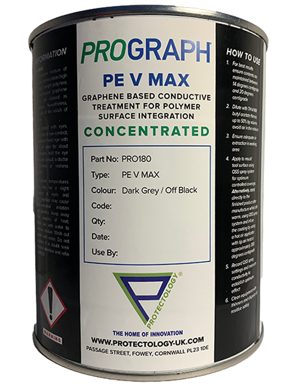 Our PE-V line is a graphene based conductive treatment for polymer surface integration. It is a complex synthetic hydrocarbon high-molecular-weight polymers and micronized graphene, and is best applied using the TASS spray equipment, which can control the coating accurately to within microns. This product is ideal for anti-static and electro conductive applications.